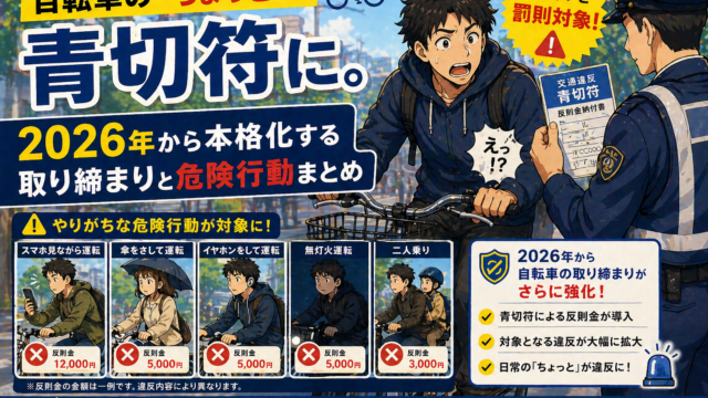 2026年4月から自転車にも赤切符・青切符制度が本格導入!飲酒・無灯火・ながらスマホなどやってしまいがちな危険行為と反則金を一覧で解説。前科のつく赤切符とは?今すぐ確認しましょう。
